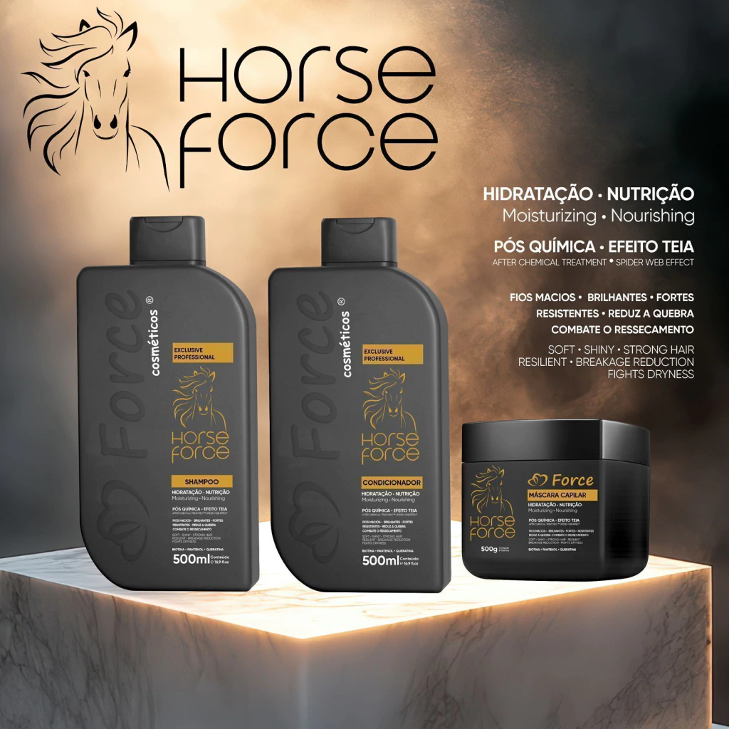 Esta fórmula exclusiva foi desenvolvida para reduzir a quebra, combater o ressecamento e deixar os cabelos mais fortes, macios e brilhantes. Composto por shampoo, condicionador e máscara capilar, o HORCE FORCE é ideal para quem busca restaurar a saúde dos fios danificados por processos químicos.